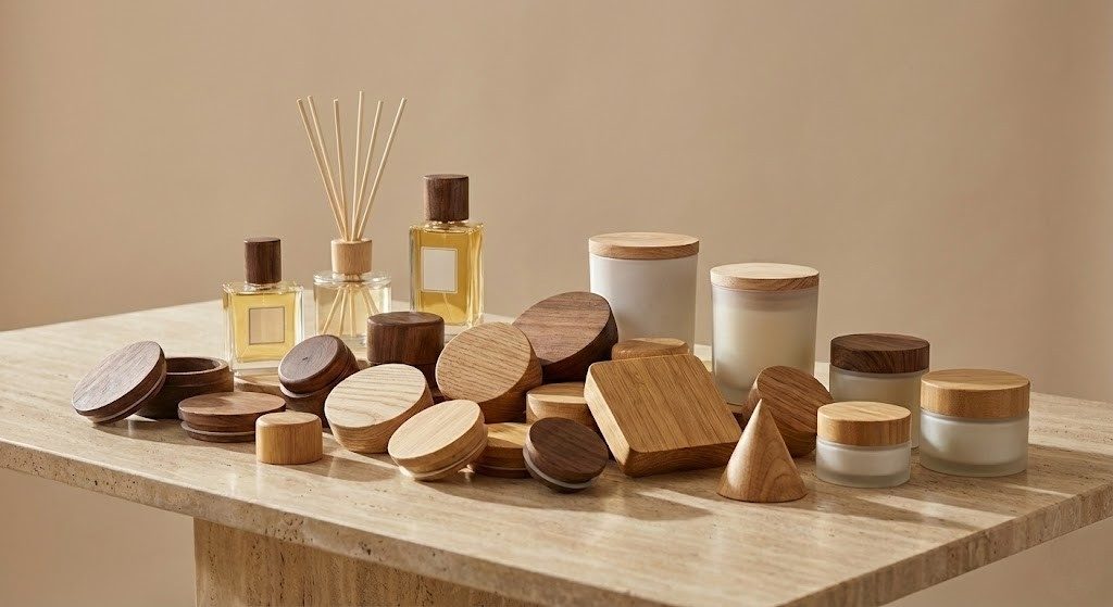 Perfume Bottles – Wooden caps paired with refillable glass bottles combine elegance with practicality.